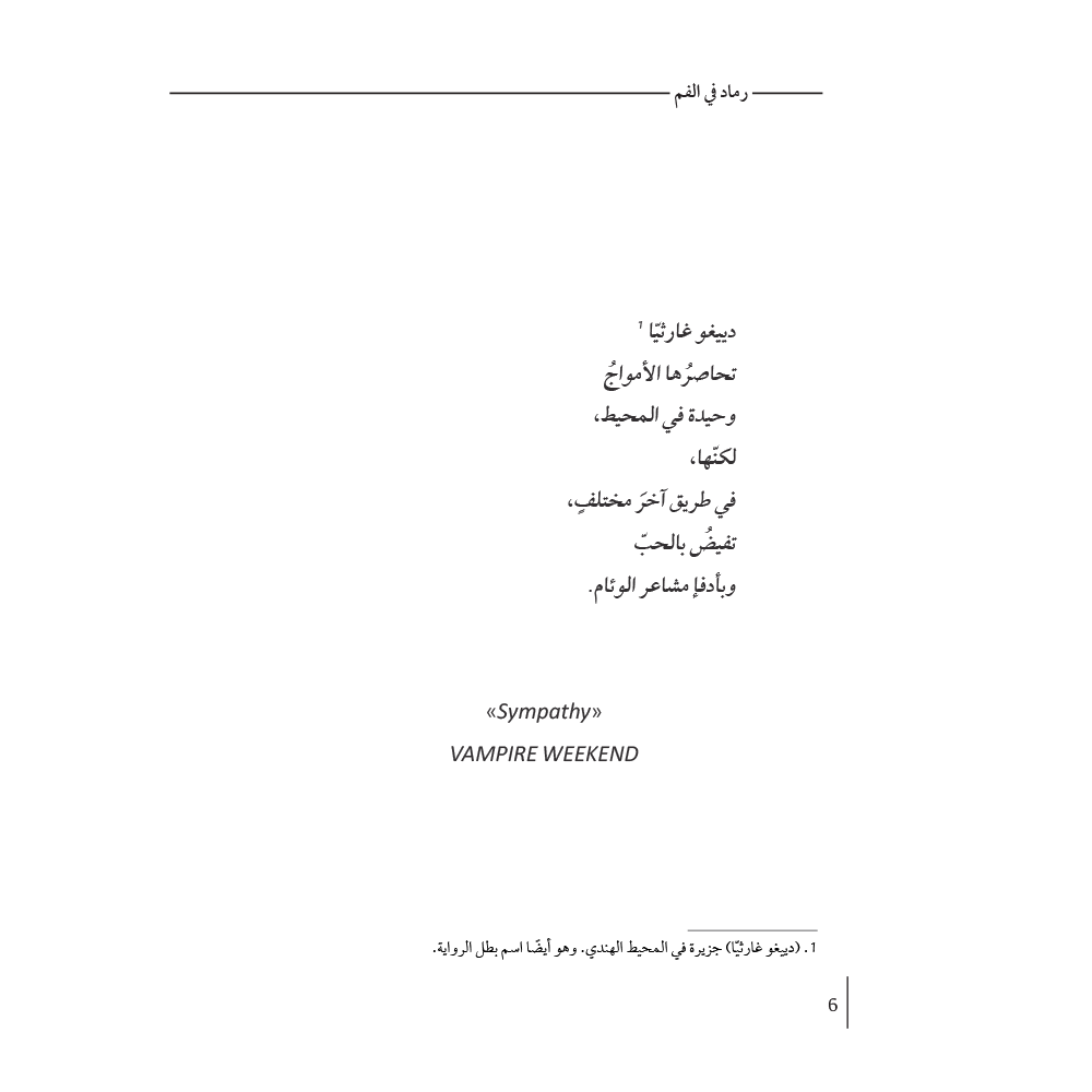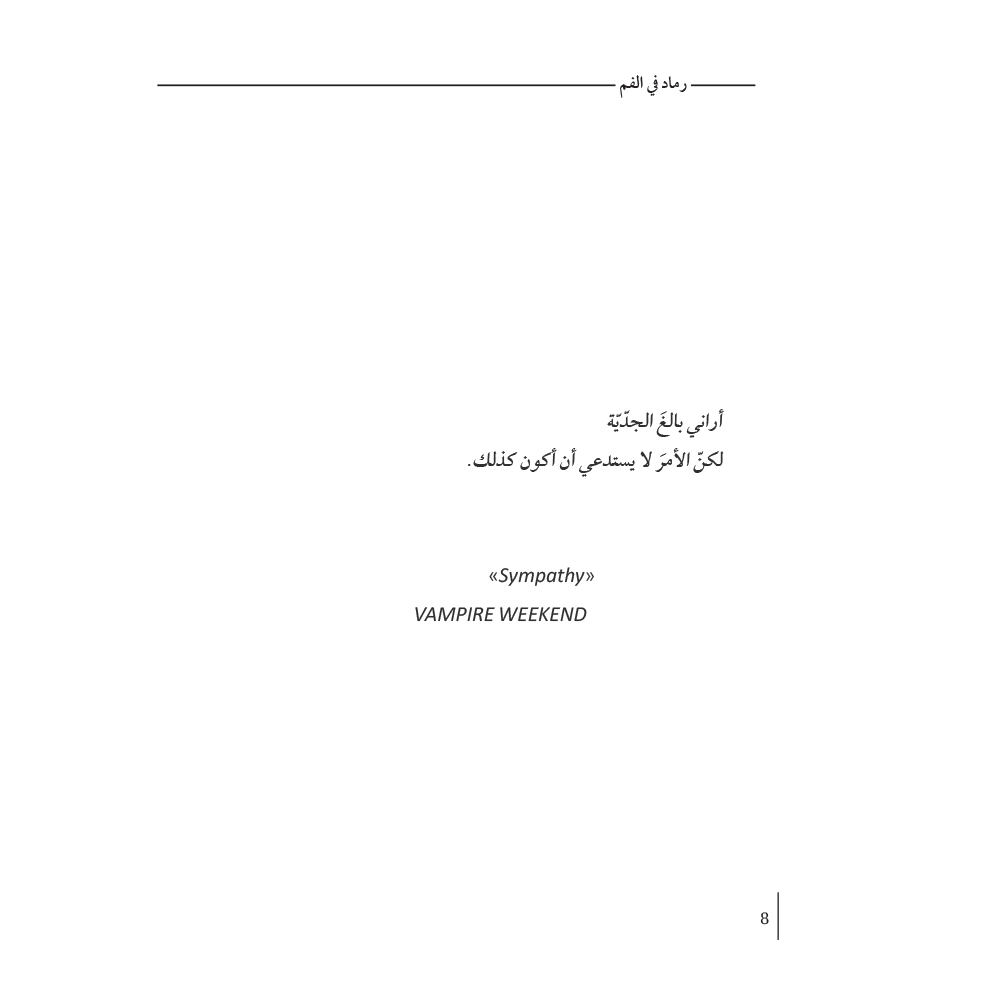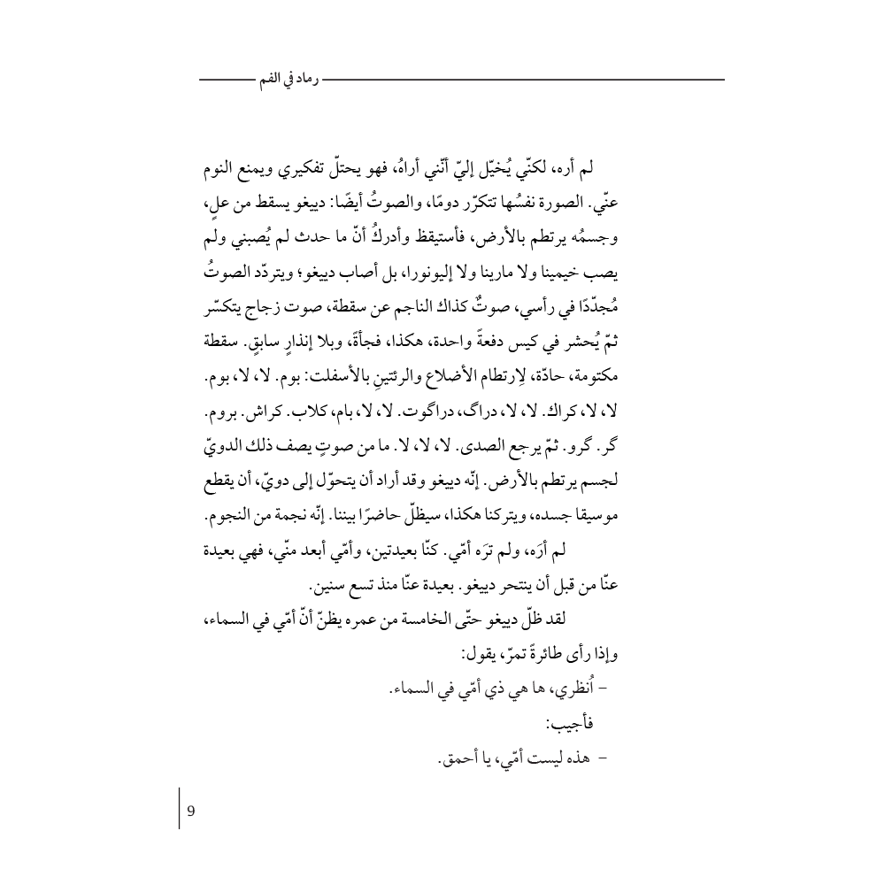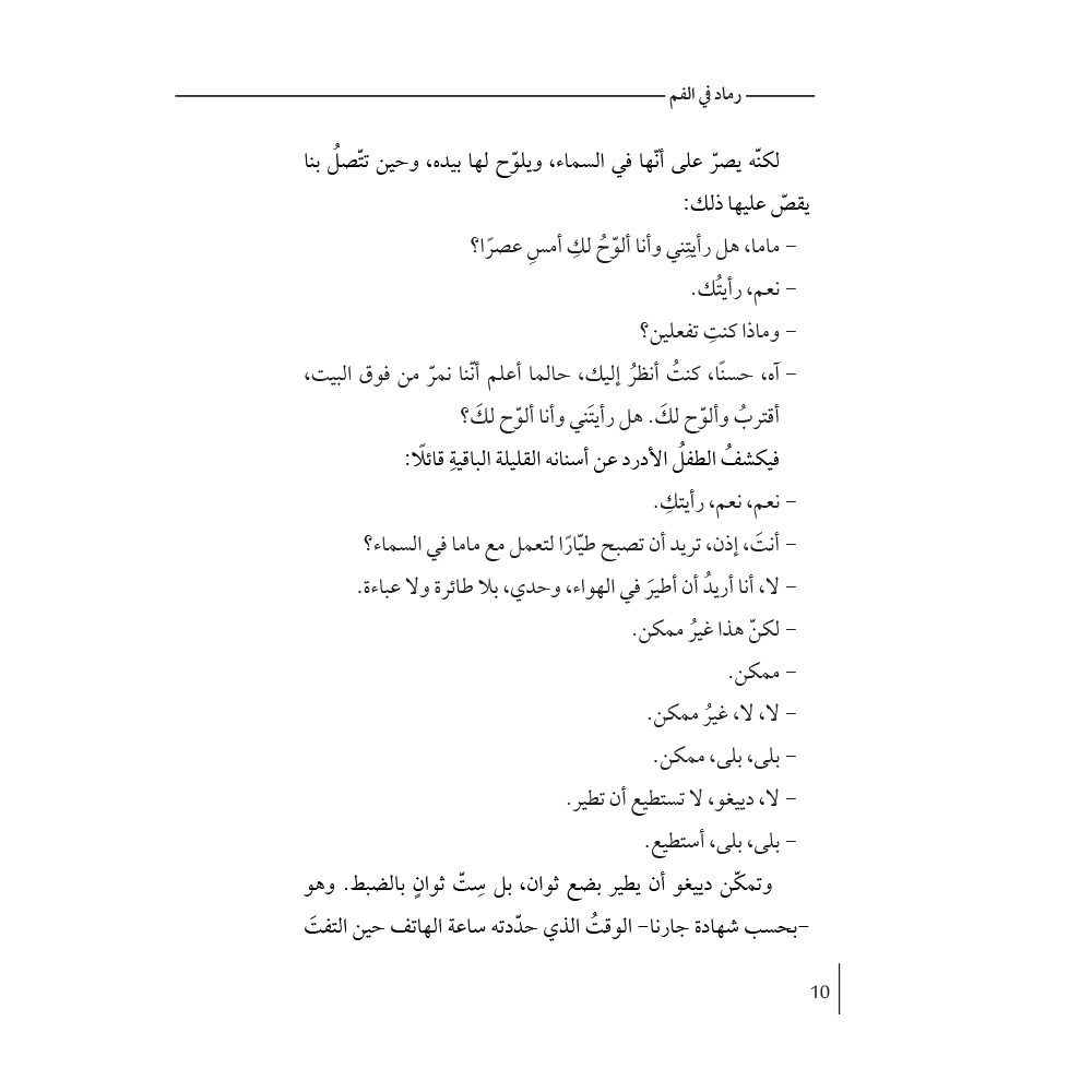 رماد في الفم تسرد هذه الرواية رحلة عاطفية لامرأة شابة تحاول استكشاف أسباب انتحار شقيقها المراهق، وتعيش متلازمتها "يوليسيس" الخاصة، إذ لا يمثّل الطريق إلى البيت أو العودة منه أي فارق بالنسبة لها. هذه رواية عن الانفصال والفقدان، والشوق والغضب، الخسارة وبدايات الحياة الجديدة. تطرح بريندا نافارو، بشجاعة، قضايا مختلفة مثل: عدم المساواة، العائلة، الهجران، والمنفى. كتاب شاعري ومؤلم يطرح سؤالًا عميقًا: ما نوع الحياة التي تستحق أن نعيشها؟!