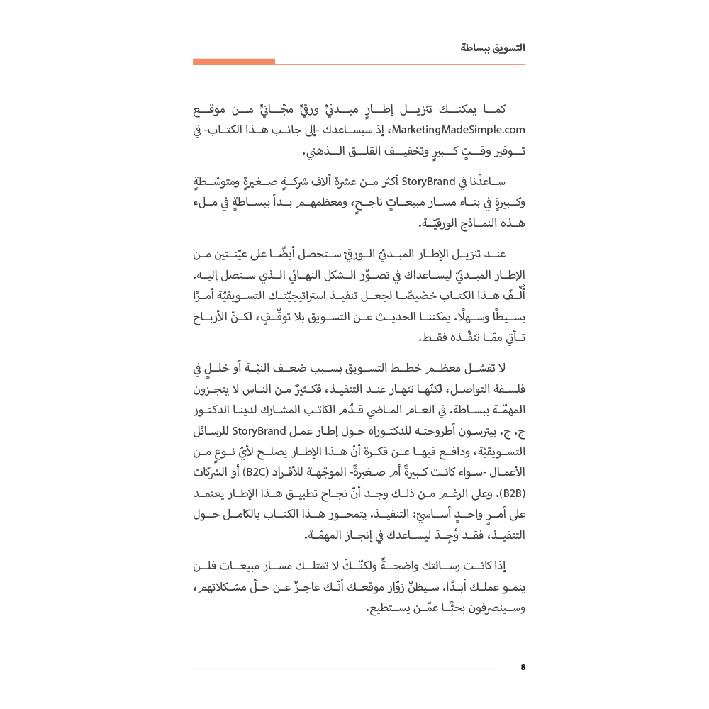 يقدّم المؤلف دونالد ميلر، صاحب إطار StoryBrand الشهير، خطوات واضحة لصياغة رسالة تسويقية تجذب العملاء وتزيد من المبيعات. يتناول الكتاب بأسلوب بسيط وفعّال كيفية بناء مسار تسويقي يبدأ من تحديد عرض القيمة، ويمر بتصميم الصفحة التعريفية، ونشرات البريد الإلكتروني، ويصل إلى تحويل الزوّار إلى عملاء حقيقيين.