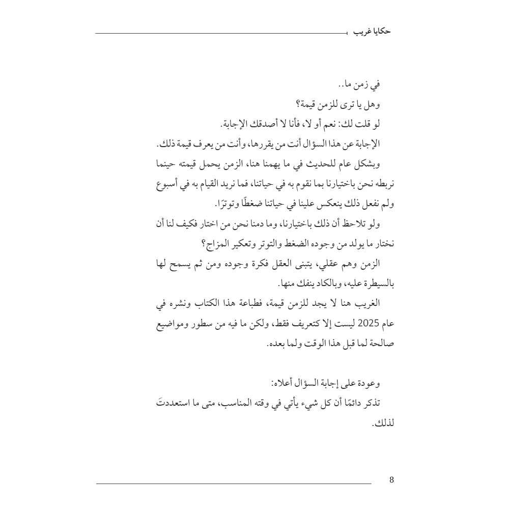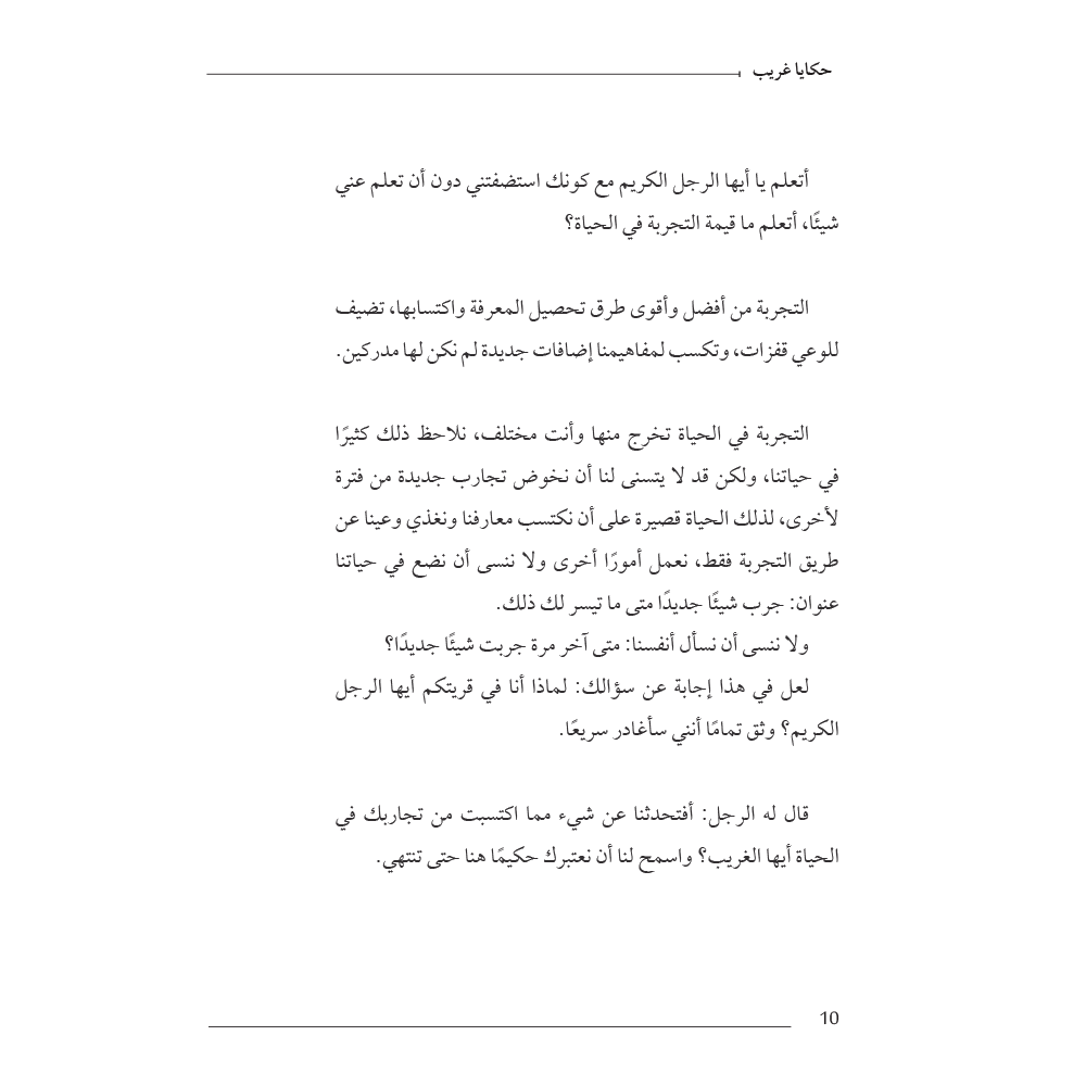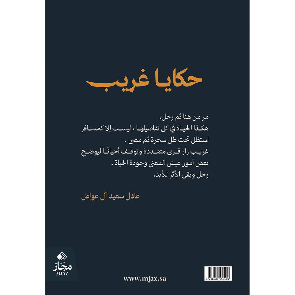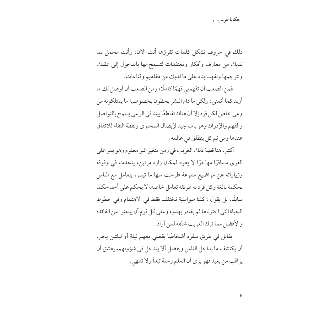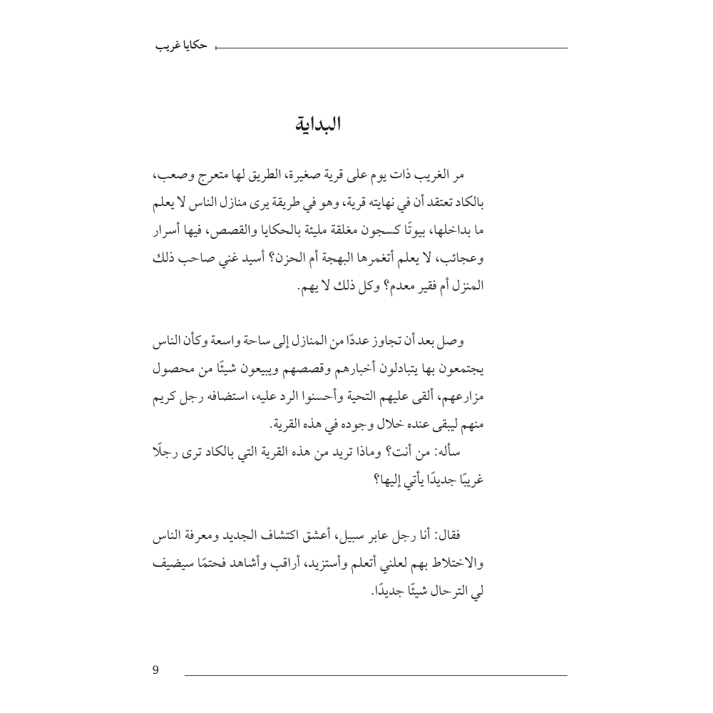أكتب هنا قصة ذلك الغريب في زمن متغير غير معلوم وهو يمر على القرى مسافرًا مهاجرًا لا يعود لمكان زاره مرتين، يتحدث في وقوفه وزياراته عن مواضيع متنوعة طرحت منها ما تيسر، يتعامل مع الناس بحكمة بالغة وكل فرد له طريقة تعامل خاصة، لا يحكم على أحد حكمًا سابقًا، بل يقول : كلنا سواسية نختلف فقط في الاهتمام وفي خطوط الحياة التي اخترناها ثم يغادر بهدوء وعلى كل قوم أن يبحثوا عن الفائدة والأفضل مما ترك الغريب خلفه لمن أراد.