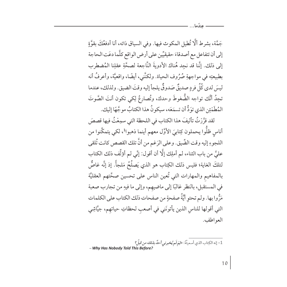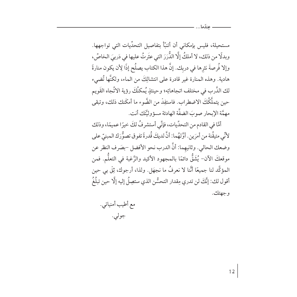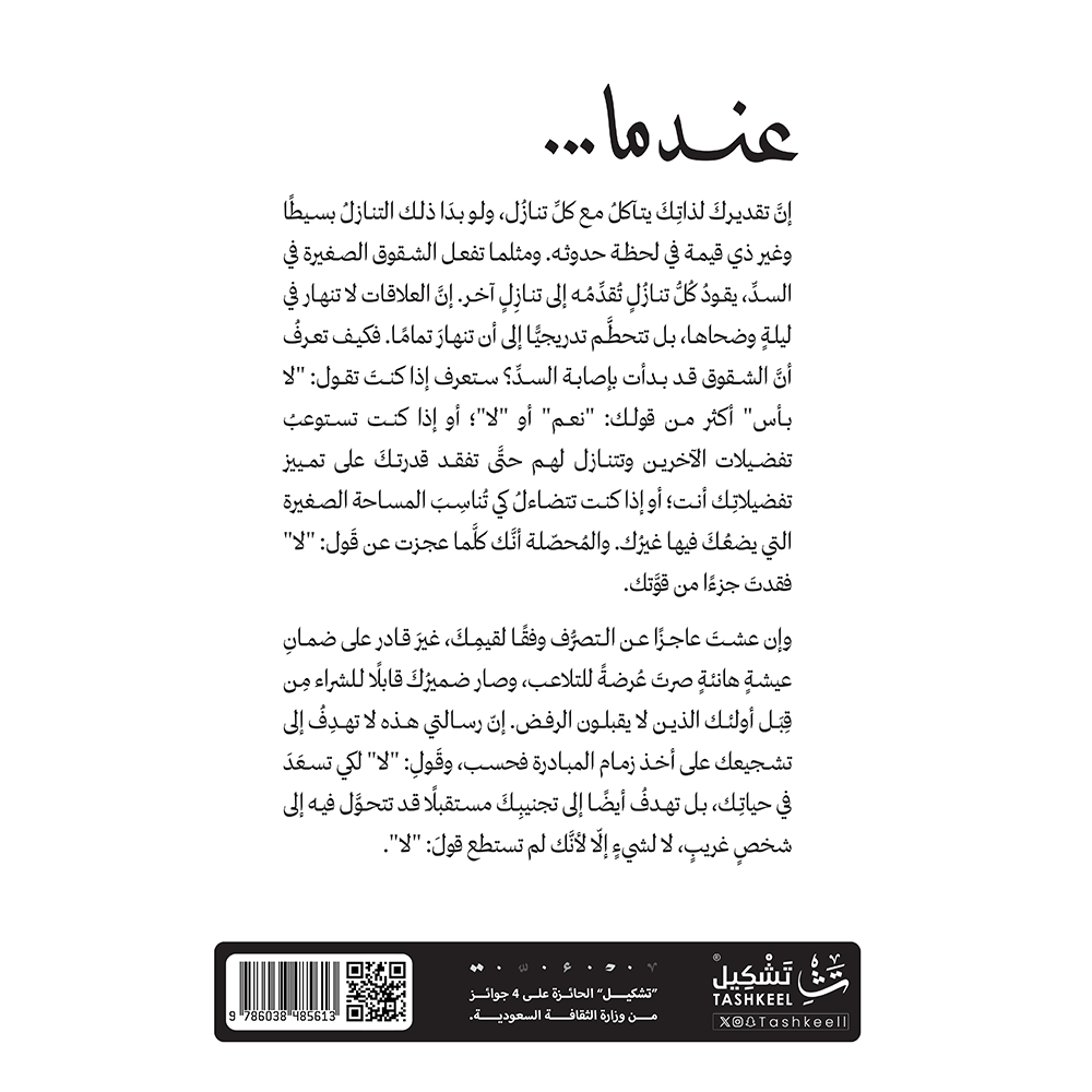 إنَّ تقديركَ لذاتِكَ يتآكلُ مع كلِّ تنازُل، ولو بدَا ذلك التنازلُ بسيطًا وغير ذي قيمة في لحظة حدوثه. ومثلما تفعل الشقوق الصغيرة في السدِّ، يقودُ كُلُّ تنازُلٍ تُقدِّمُه إلى تنازِلٍ آخر. إنَّ العلاقات لا تنهار في ليلةٍ وضحاها، بل تتحطََّم تدريجيًّا إلى أن تنهارَ تمامًا. فكيف تعرفُ أنَّ الشقوق قد بدأت بإصابة السدِّ؟ ستعرف إذا كنتَ تقول: "لا بأس" أكثر من قولك: "نعم" أو "لا"؛ أو إذا كنت تستوعبُ تفضيلات الآخرين وتتنازل لهم حتَّى تفقد قدرتكَ على تمييز تفضيلاتِك أنت؛ أو إذا كنت تتضاءلُ كي تُناسِبَ المساحة الصغيرة التي يضعُكَ فيها غيرُك. والمُحصّلة أنَّك كلَّما عجزت عن قَول: "لا" فقدتَ جزءًا من قوَّتك. وإن عشتَ عاجزًا عن التصرُّف وفقًا لقيمِكَ، غيرَ قادر على ضمانِ عيشةٍ هانئةٍ صرتَ عُرضةً للتلاعب، وصار ضميرُكَ قابلًا للشراء مِن قِبَل أولئك الذين لا يقبلون الرفض. إنّ رسالتي هذه لا تهدِفُ إلى تشجيعك على أخذ زمام المبادرة فحسب، وقَولِ: "لا" لكي تسعَدَ في حياتِك، بل تهدفُ أيضًا إلى تجنيبِكَ مستقبلًا قد تتحوَّل فيه إلى شخصٍ غريبٍ، لا لشيءٍ إلّا لأنَّك لم تستطع قولَ: "لا".