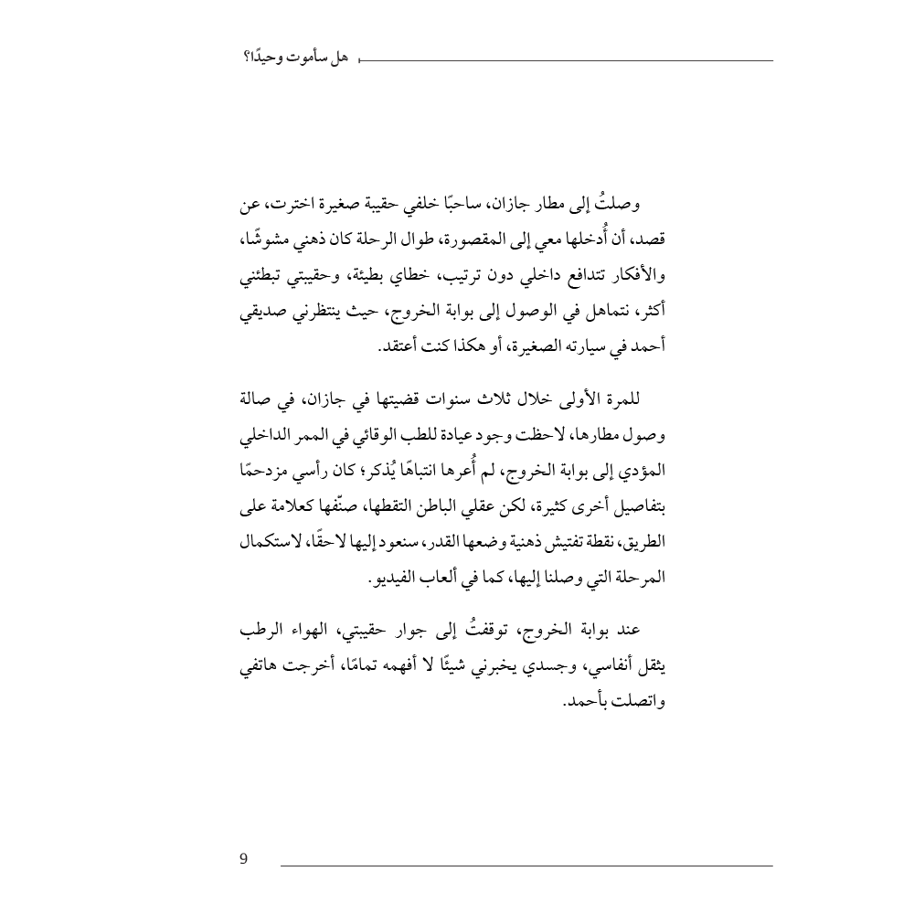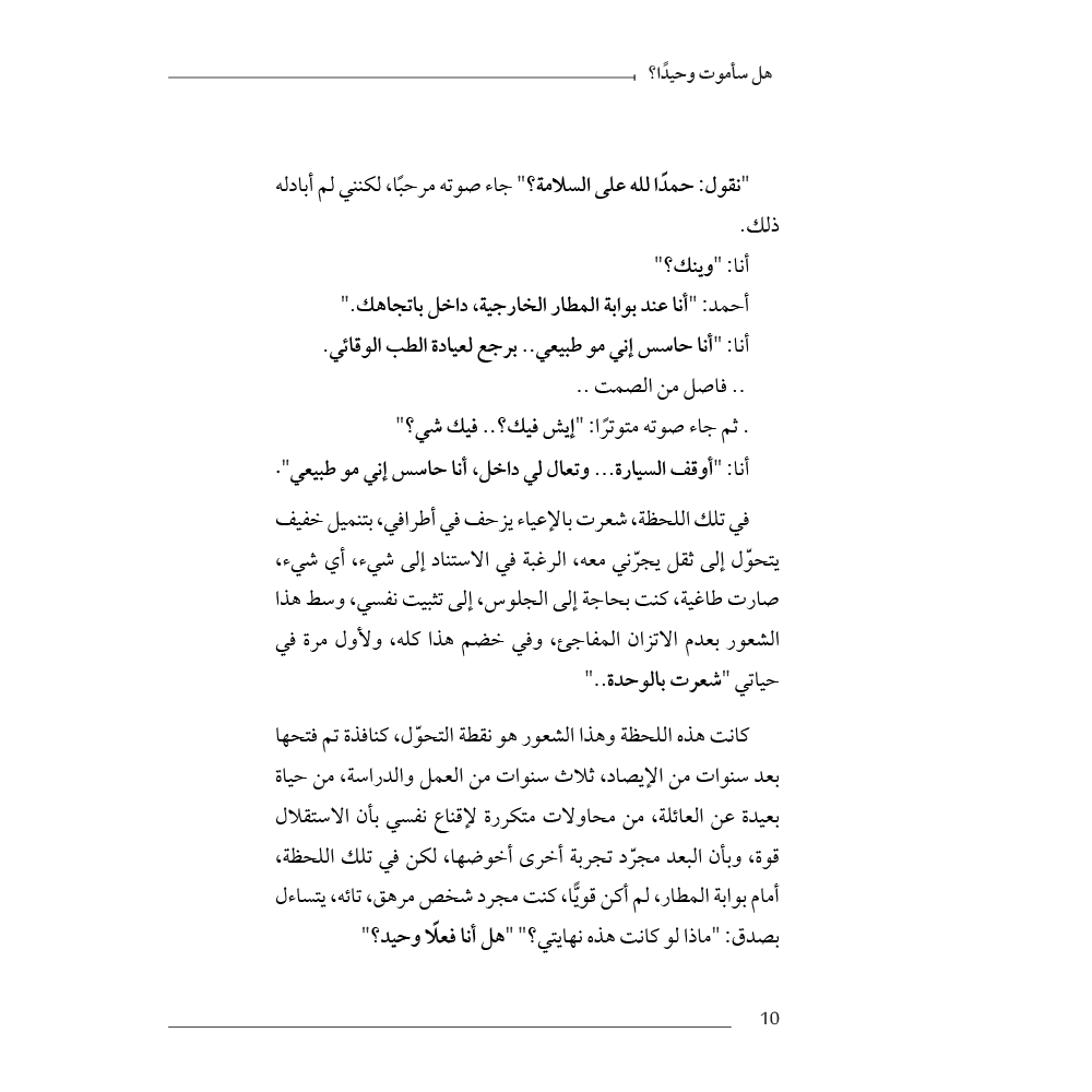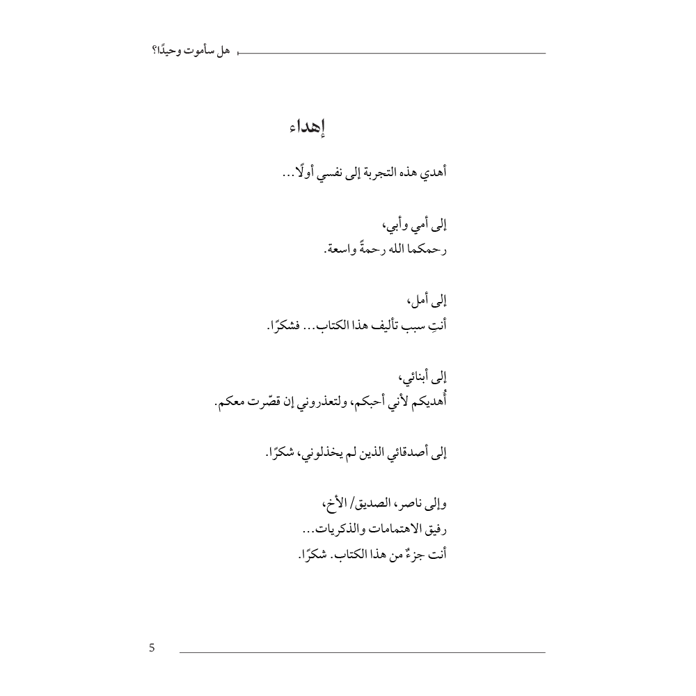 "هل سأموت وحيدًا؟" ليس كتابًا عن الموت بقدر ما هو بحث عميق في الحياة، وفي الشعور الصامت بالوحدة التي قد تملأ الزوايا حتى في الأماكن المزدحمة. كلمات الكتاب تتلمس المناطق التي نتفاداها عادةً، وتضع القارئ أمام ذاته بلا أقنعة، ليواجه السؤال الذي نهمس به ولا نعلنه.