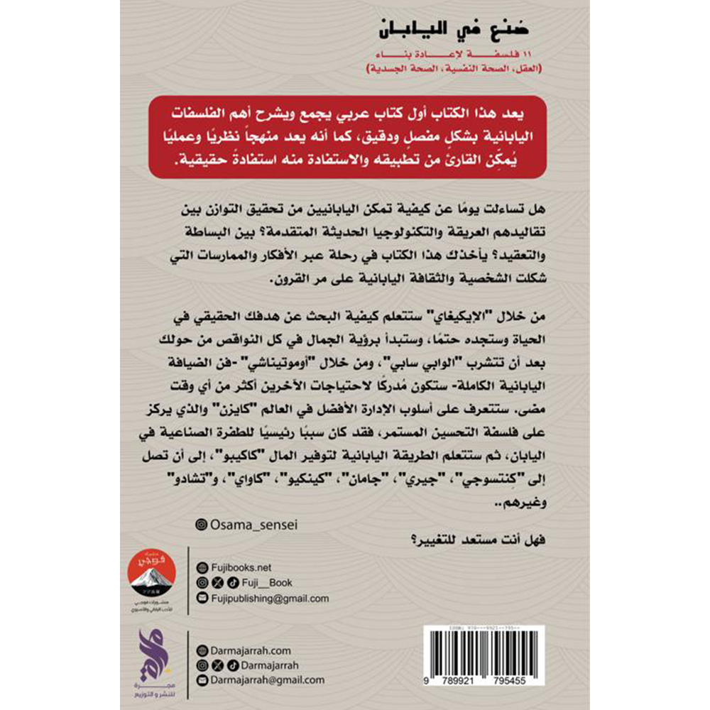 يعد هذا الكتاب أول كتاب عربي يجمع ويشرح أهم الفلسفات اليابانية بشكل مفصل ودقيق، كما أنه يعد منهجاً نظريًا وعمليًا يمكن القارئ من تطبيقه والاستفادة منه استفادة حقيقية هل تساءلت يوما عن كيفية تمكن اليابانيين من تحقيق التوازن بين تقاليدهم العريقة والتكنولوجيا الحديثة المتقدمة؟ بين البساطة والتعقيد ؟ يأخذك هذا الكتاب في رحلة عبر الأفكار والممارسات التي شكلت الشخصية والثقافة اليابانية على مر القرون من خلال "الإيكيغاي" ستتعلم كيفية البحث عن هدفك الحقيقي في الحياة وستجده حتمًا، وستبدأ برؤية الجمال في كل النواقص من حولك بعد أن تتشرب "الوابي سابي" ، ومن خلال "أوموتيناشي" - فن الضيافة اليابانية الكاملة - ستكون مدركا لاحتياجات الآخرين أكثر من أي وقت مضى. ستتعرف على أسلوب الإدارة الأفضل في العالم "كايزن" والذي يركز على فلسفة التحسين المستمر، فقد كان سببا رئيسيا للطفرة الصناعية في اليابان، ثم ستتعلم الطريقة اليابانية لتوفير المال "كاكيبو"، إلى أن تصل إلى "كنتسوجي" ، "جيري" ، "جامان"، "كينكيو"، "كاواي"، و"تشادو" ..وغيرهم .. فهل أنت مستعد للتغيير.