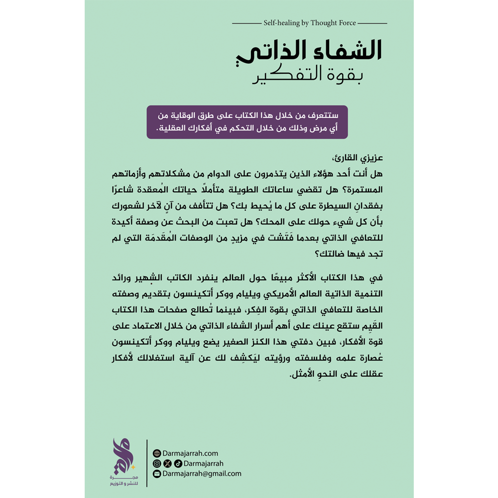عزيزي القارئ هل أنت أحد هؤلاء الذين يتذمرون على الدوام من مشكلاتهم وأزماتهم المستمرة؟ هل تقضي ساعاتك الطويلة متأملاً حياتك المعقدة شاعرًا بفقدان السيطرة على كل ما يحيط بك ؟ هل تتأفف من آن لآخر لشعورك بأن كل شيء حولك على المحك ؟ هل تعبت من البحث عن وصفة أكيدة للتعافي الذاتي بعدما فتشت في مزيد من الوصفات المقدمة التي لم ستتعرف من خلال هذا الكتاب على طرق الوقاية من أي مرض وذلك من خلال التحكم في أفكارك العقلية. تجد فيها ضالتك ؟ في هذا الكتاب الأكثر مبيعًا حول العالم ينفرد الكاتب الشهير ورائد التنمية الذاتية العالم الأمريكي ويليام ووكر أتكينسون بتقديم وصفته الخاصة للتعافي الذاتي بقوة الفكر، فبينما تطالع صفحات هذا الكتاب القيم ستقع عينك على أهم أسرار الشفاء الذاتي من خلال الاعتماد على قوة الأفكار، فبين دفتي هذا الكنز الصغير يضع ويليام ووكر أتكينسون عصارة علمه وفلسفته ورؤيته ليكشف لك عن آلية استغلالك لأفكار عقلك على النحو الأمثل.