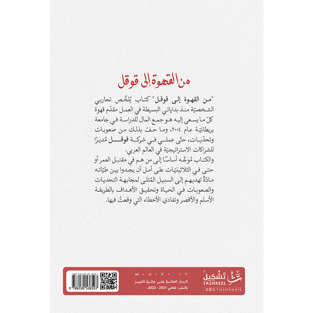 "من القهوة إلى قوقل" كتاب يُلخِّص تجارب المؤلف الشخصيّة منذ بداياته البسيطة في العمل مقدّم قهوة كلّ ما يسعى إليه هو جمع المال للدراسة في جامعة بريطانيّة عام ٢٠٠٤، وما حفّ بذلك من صعوبات وتحدّيات، حتّى عمله في شركة قوقل مُديرًا للشراكات الاستراتيجيّة في العالم العربي.