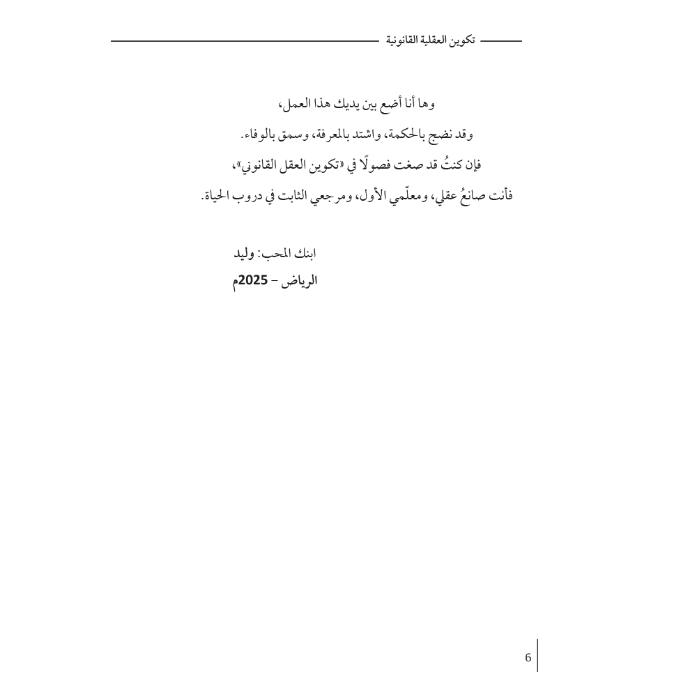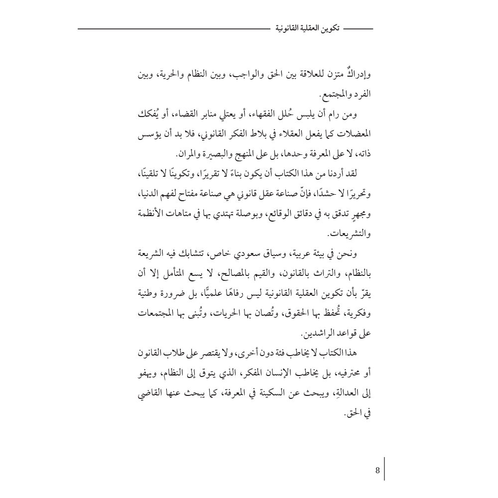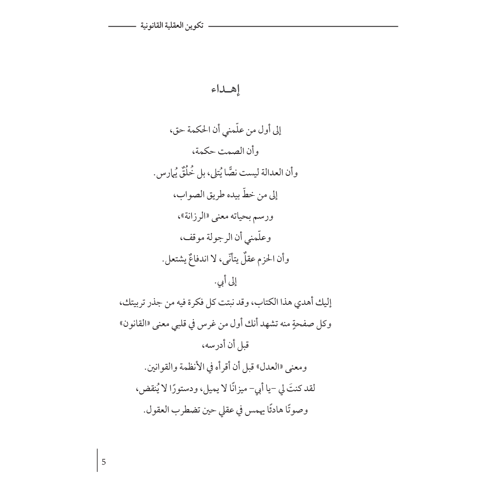 وما أجدر القارئ وهو يطالع هذا الكتاب أن يستحضر أن القانون ليس نصًّا جامدًا ولا مسلكًا مفروضًا، بل هو فنُّ فَهْمِ الإنسان لذاته، ومجتمعه، وموقعه من الحق! فإذا بلغ به الأمر أن يقرأ في هذا الكتاب ما يعيد تشكيل نظرته، أو يُنضج منطقه، أو يوقظ عقله، فذلك مبلغ الرجاء وعين الأمنية.