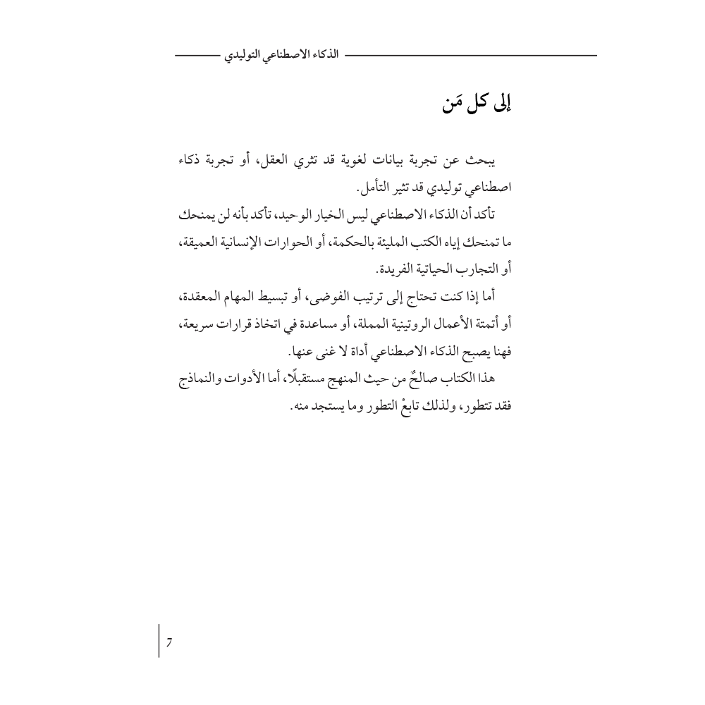 يُقدّم هذا الكتاب أهم تطبيقات الذكاء الاصطناعي التوليدي والوكلاء الأذكياء على مجال حدّدناه، وهو مجال علوم العربية الأساسية: النحو والبلاغة، ودور تلك التطبيقات في تحليل الوسائط المتعدد في السياق اللغوي الثقافي.ولا يقتصر هذا الكتاب على هذه العلوم، فهدفه أساسا هو عرض التطبيقات الذكية وممارساتها، سواء كان في هذه العلوم ومهاراتها، أو في أي مجال آخر في الإدارة أو في القانون أو في الأدب أو في غيره.
