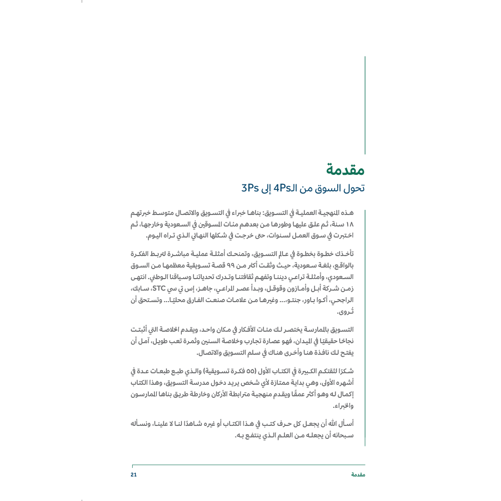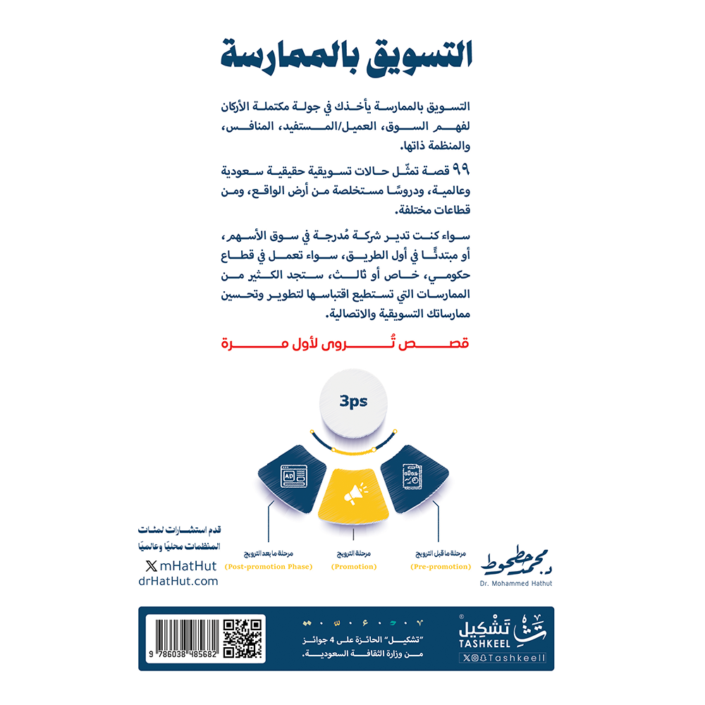 التسويق بالممارسة يأخذك في جولة مكتملة الأركان لفهـم السـوق، العميـل/المـستفيد، المنافس، والمنظمة ذاتها.99 قصة تمثّل حالات تسويقية حقيقية سعودية وعالمية، ودروسًا مستخلصة من أرض الواقع، ومن قطاعات مختلفة. سواء كنت تدير شركة مُدرجة في سوق الأسهم، أو مبتدئًا في أول الطريق، سواء تعمل في قطاع حكومي، خاص أو ثالـث، ستجد الكثير من الممارسات التي تستطيع اقتباسها لتطوير وتحسين ممارساتك التسويقية والاتصالية.
