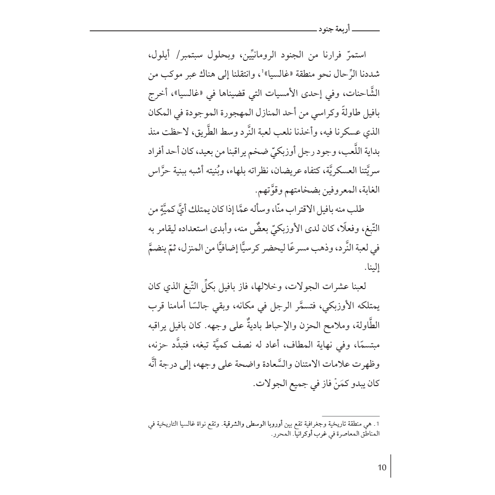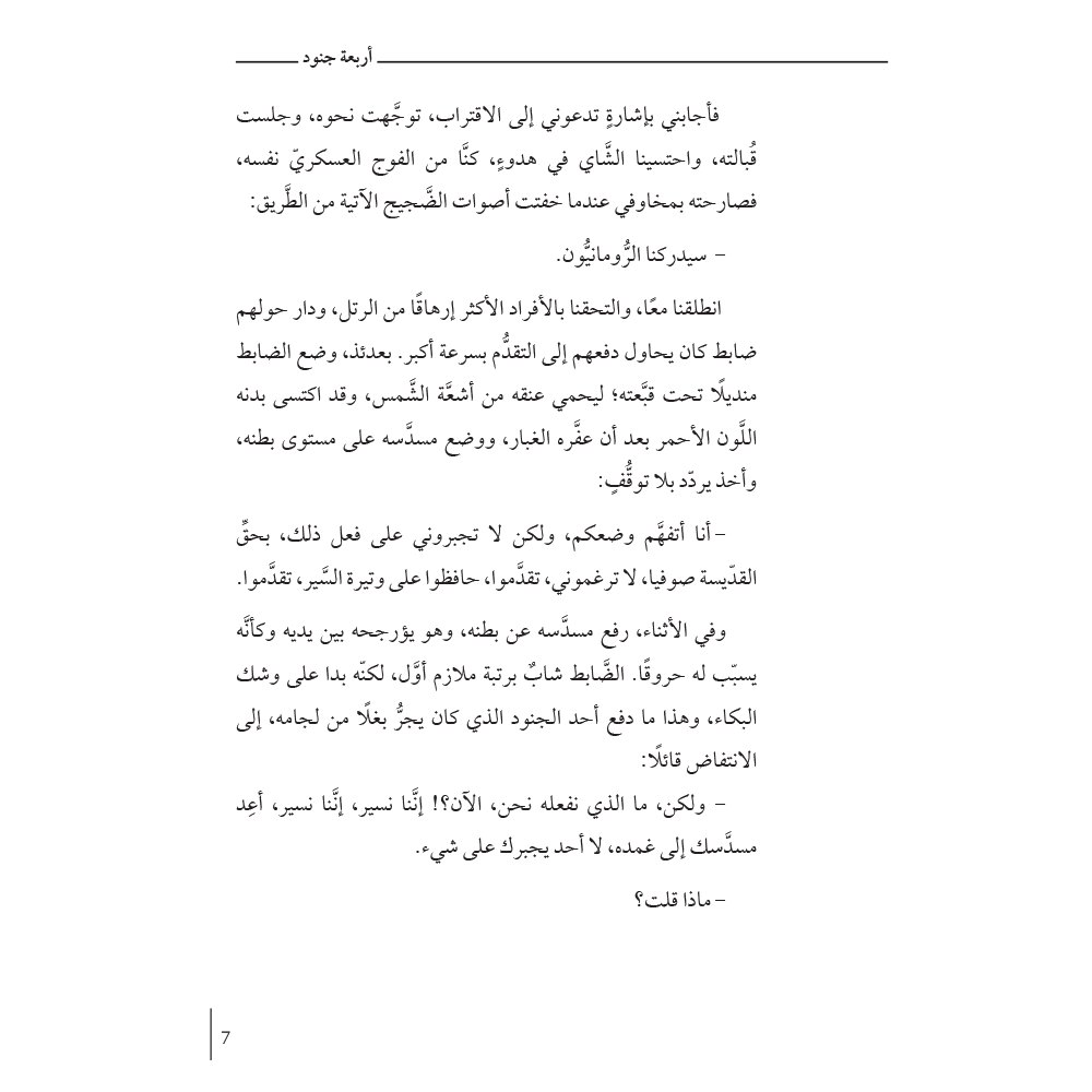أربعة جنود في شتاء عام 1919، وبين أنقاض الحرب وارتباك الأخلاق وقسوة الواقع، يجد أربعة جنود أنفسهم في مواجهة مستمرّة مع نهايتهم المحتملة، ويتضح أن المتطوّع بينهم هو الوحيد الذي يستطيع كتابة الشهادة على ما يعايشونه. تدور الحوارات بينهم كأنها محاولات بائسة للنجاة بالذاكرة، وترتسم من خلالها الصورة الإنسانية حول الصداقة، وعن الشعور، وكيف يمكن لابتسامة عابرة أو لحظة صفاء أن تخفف فداحة الخراب الذي خلّفته الحرب.