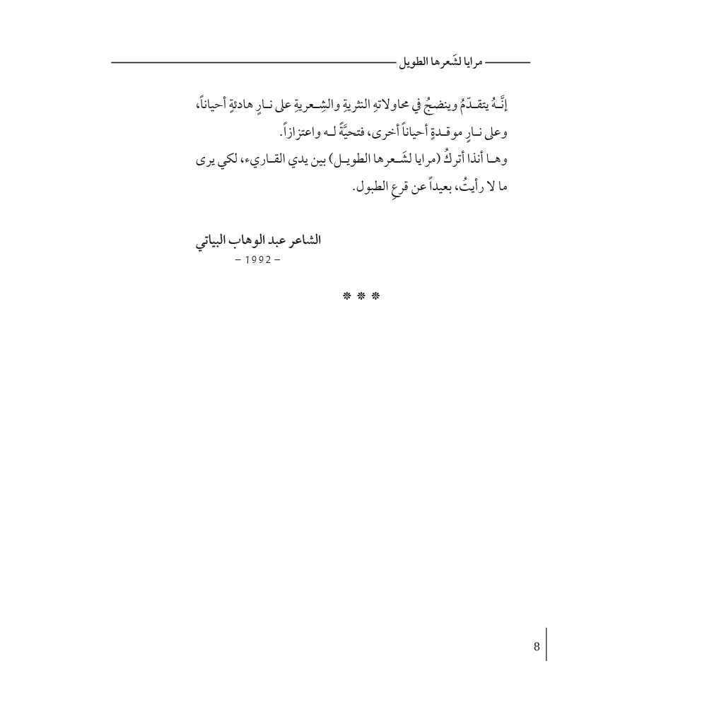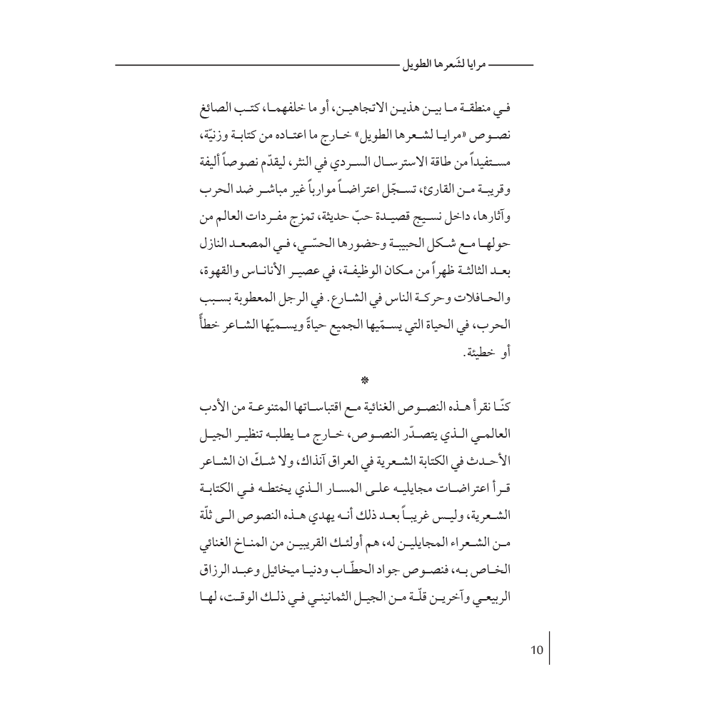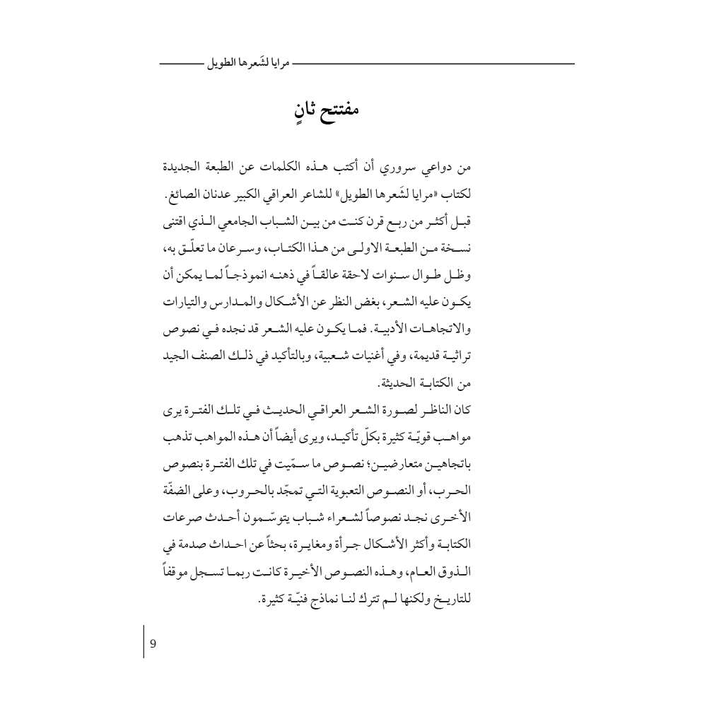 بعد أكثر من ربع قرن ما زالت نصوص «مرايا لشعرها الطويل» صالحة للقراءة نابضة بالحياة، انعتقت من إسار التجييل والارتباط بلحظة تاريخية محددة لها متطلباتها الثقافية والسياسية وسمات غالبة على ما يعطي للأدب صفة الحداثة والتجديد.