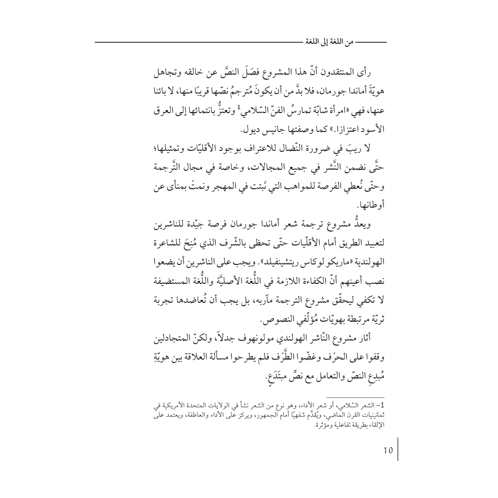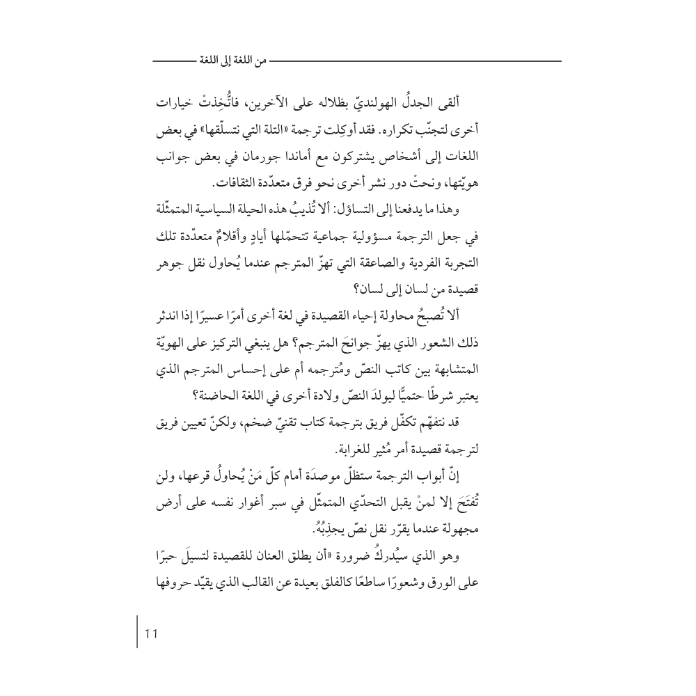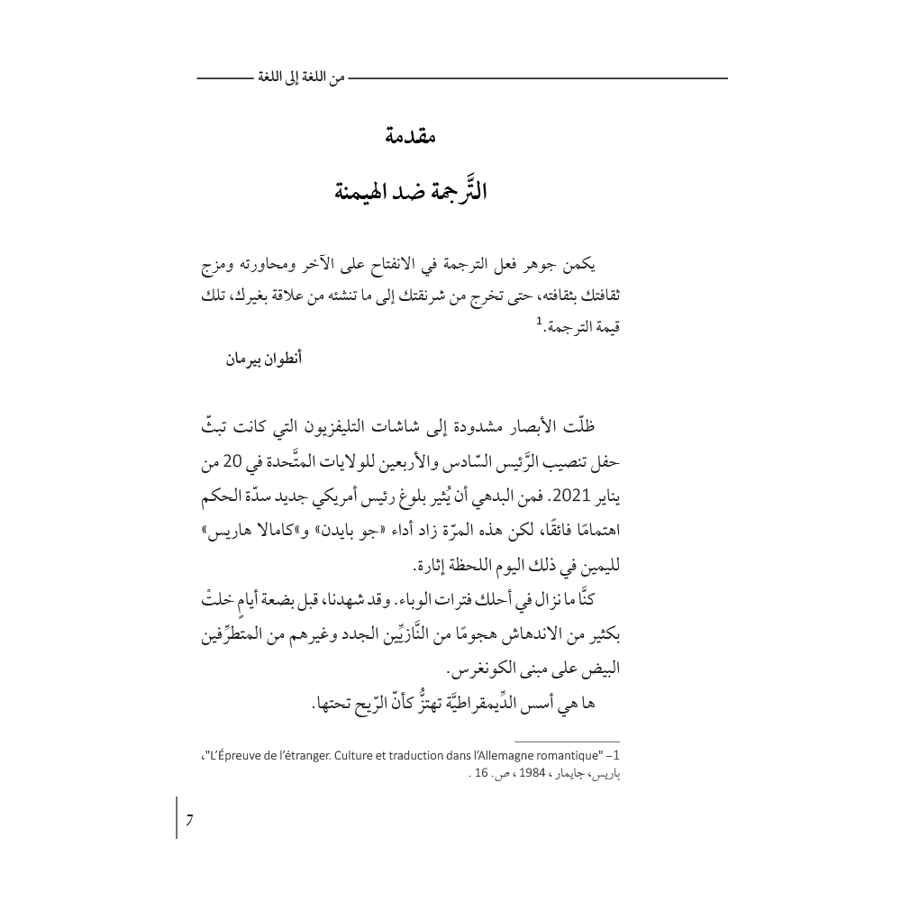 هذا الكتاب تأمّلٌ في التّرجمة بالبصيرة لا بالبصر، وتمعّنٌ في قوّتها وقدرتها على مدّ جسور التواصل بين الثقافات ونسجِ الصّلاتِ بين مختلف الهويّات. فالتّرجمة محادثة بين لسانين وتفاهم بين مُختلفين، وقيمتها لا تكمن إلا في تفاعلها مع غيرها، كما يرى أنطوان بيرمان. وبين دفّتي هذا الكتاب تمدُّ الشعوب أذرعها وتنسج بأقلامها خيوطًا تقرّبُ النائي وتدُني البائنَ، وفي ثناياه ينظمُ مؤلّفه سلْكَ الكلامَ مادحًا التّرجمة، كادِحا ليبرزَ ما يمكنُ أن تُحقّقه.