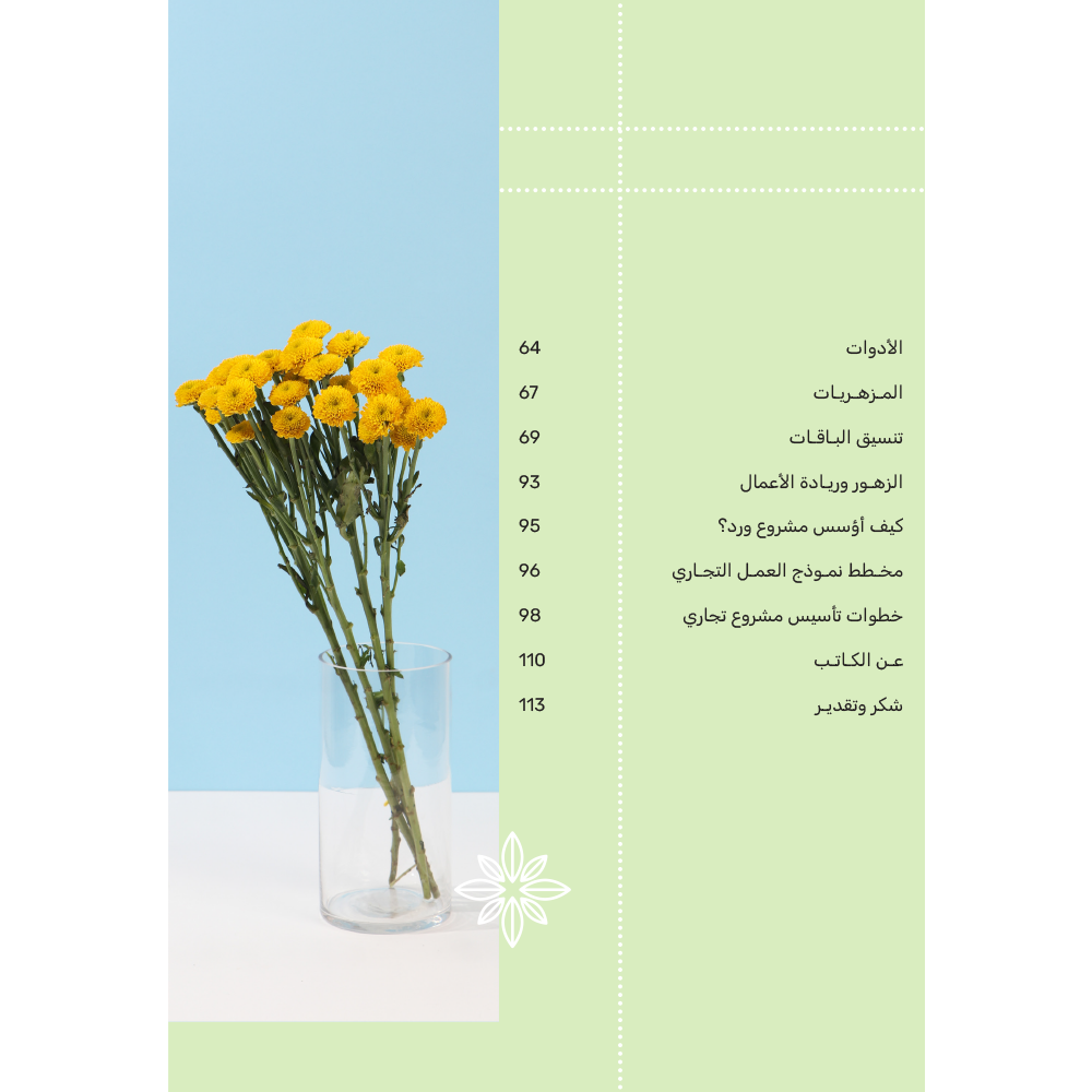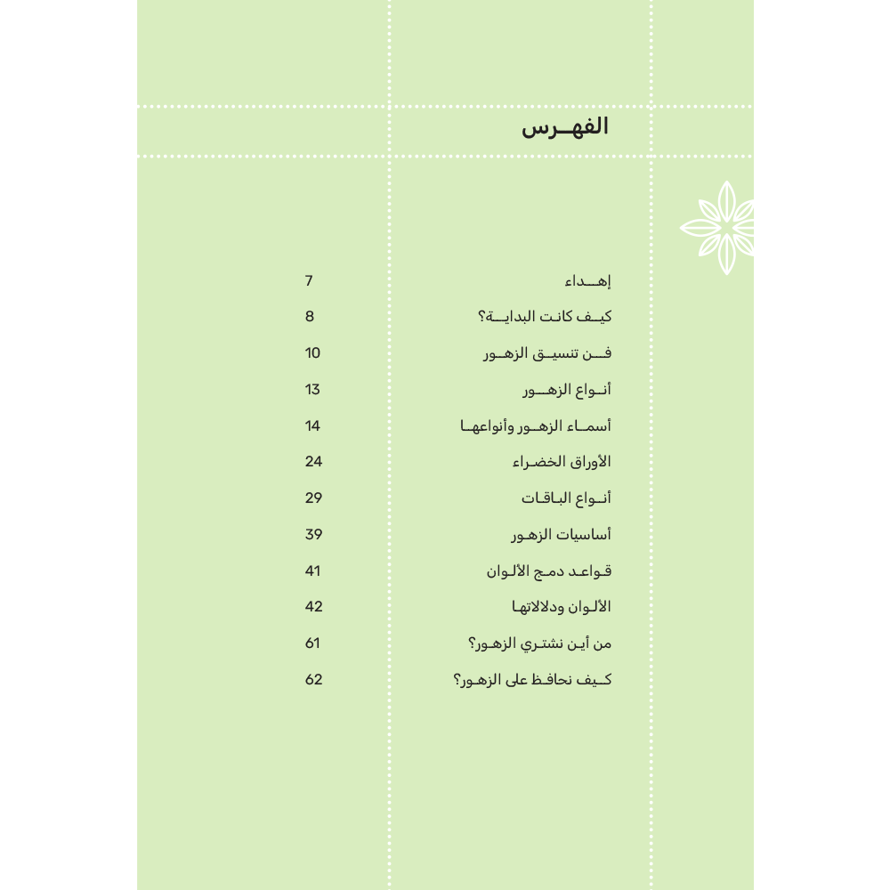 بين صفحاته، يجد القارئ شروحًا مدعومة بأمثلة وصور توضيحية حول تنسيق المناسبات، اختيار الزهور وفق الفصول، مزج الروائح والألوان، إضافة إلى نصائح للعناية بالزهور وحفظها أطول فترة ممكنة. الكتاب لا يخاطب المحترفين فقط، بل كل من يرغب في دخول عالم تنسيق الزهور بخطوات واثقة وسهلة.